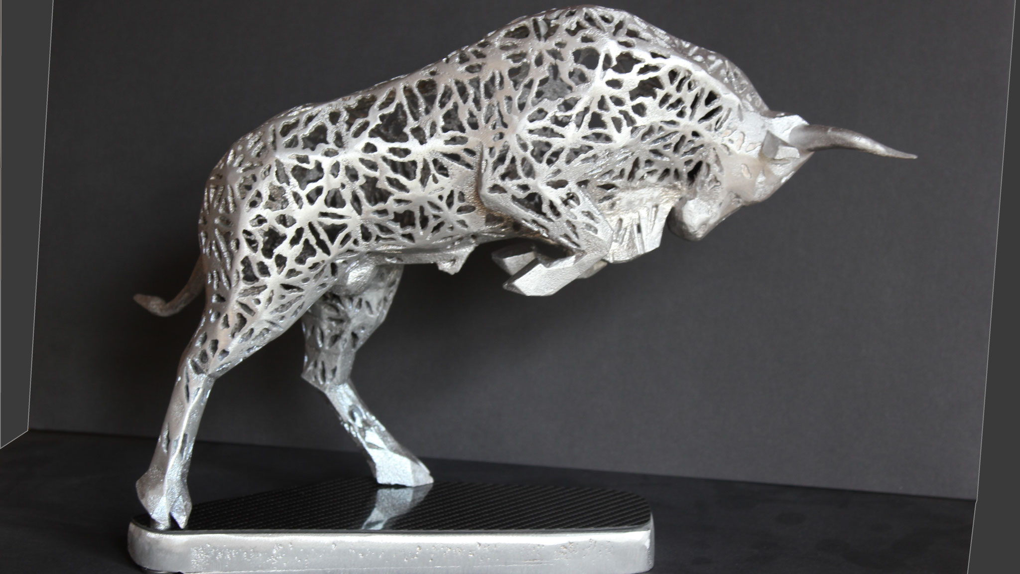 Die Aluminiumguss-Miniatur des "Bullen aus Stahl" stützt sich auf einen Sockel, der in abstrakter und vereinfachter Form den Verlauf der Rennstrecke des Rings repräsentiert.