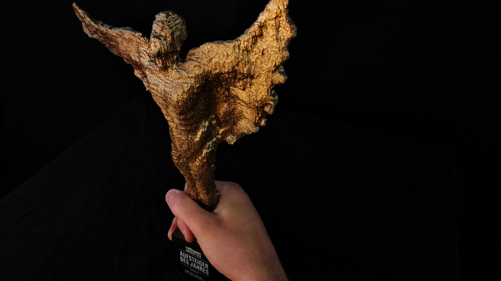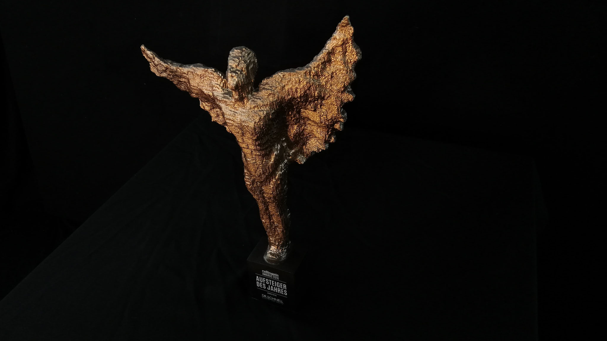Der Pokal ist eine abstrahierte Darstellung von Daidalos, einer Figur der griechischen Mythologie.